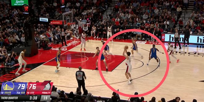 后续还有两个球更精彩,下一个关键回合杨瀚森直接和库里对飙三分了。当时开拓者76-79落后3分,杨瀚森在三分线外拿球之后,希尔德冲上来想防他,结果他做了一个传球假动作,把希尔德重心完全骗开。自己稳稳出手三分飙中,回过头来库里的三分也命中了,他和库里在这个回合对飙三分,太精彩了。
