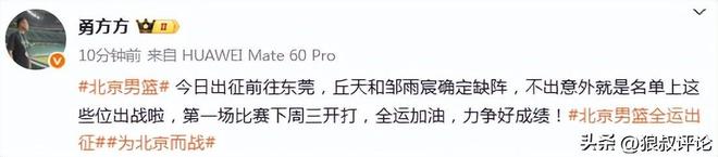 北京时间11月1日,根据媒体人“勇方方”的报道,北京男篮今日出征前往东莞,丘天和邹雨宸确定缺阵,不出意外就是名单上这些位出战啦,第一场比赛下周三开打,全运加油,力争好成绩!
