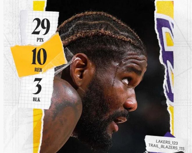 他30分钟,19投14中,罚球2投1中,得到29分10篮板2助攻3封盖。别忘了,他早早就遭遇到了五次犯规,最终造成他的上场时间有些下滑。即便是这样,艾顿还是可以在末节上场之后主导攻守,凭借自己的发挥帮助球队稳住内线,这是湖人拿下胜利的关键。